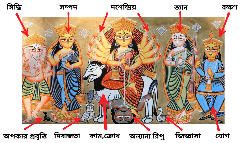 দুর্গার চার পুত্রকন্যার কল্পনাও চমকপ্রদ। লক্ষ্মী ধনের দেবী। তার বাহন পেঁচা। পেঁচা হলো দিবান্ধ। অর্থ হলে মানুষ যা হয়। লক্ষ্মী পেঁচা বশ করেছেন তার ইঙ্গিত এই অর্থের স্বভাবই হলো অর্থবানকে দিবান্ধ করে দেওয়া। এ পেচকবৃত্তি জয় না করতে পারলে লক্ষ্মীলাভ হয় না।